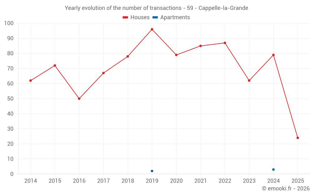 The median price on the 24 house transactions of the last 6 months in the municipality of Cappelle-la-Grande was 1 797 € per square meter for a median property value of 161 750 €. Over this period, 60% of transactions were between 1 519 and 2 045 € per square meter (from the 2nd to the 8th deciles).