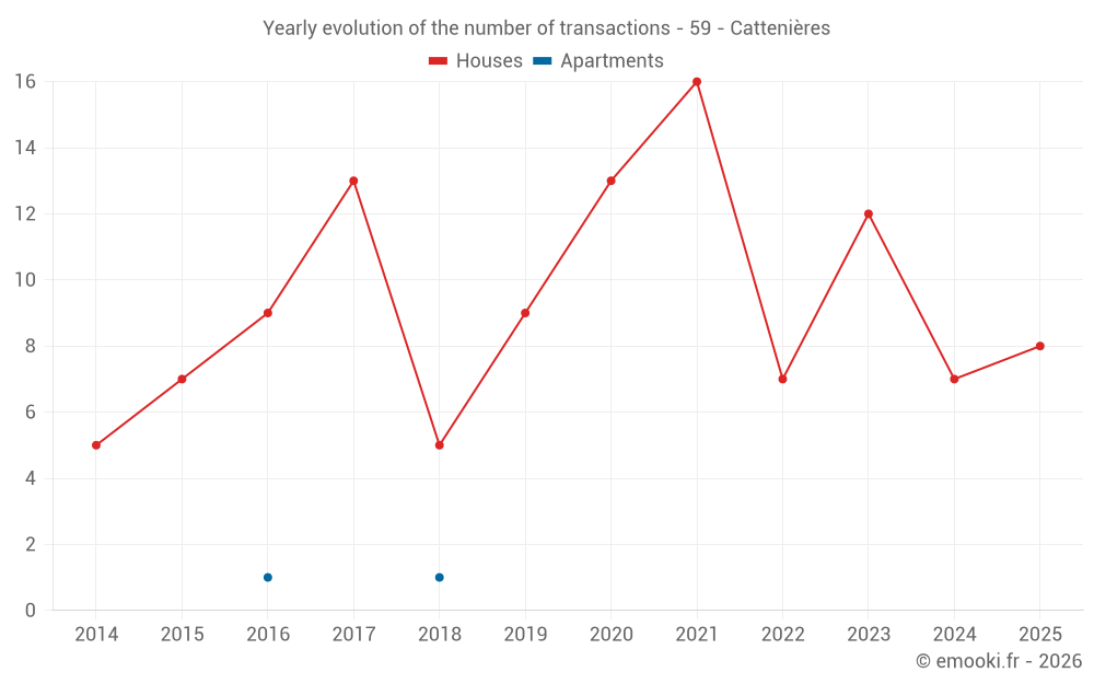 The median price on the 21 house transactions of the last 24 months in the municipality of Cattenières was 1 065 € per square meter for a median property value of 130 000 €. Over this period, 60% of transactions were between 861 and 1 637 € per square meter (from the 2nd to the 8th deciles).