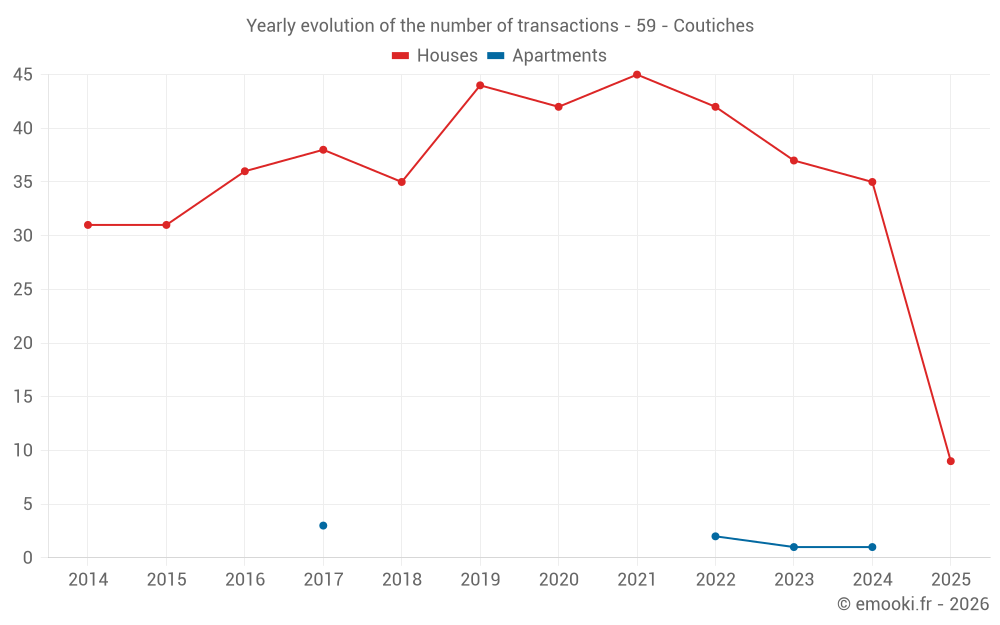 The median price on the 26 house transactions of the last 12 months in the municipality of Coutiches was 2 532 € per square meter for a median property value of 314 525 €. Over this period, 60% of transactions were between 1 848 and 3 082 € per square meter (from the 2nd to the 8th deciles).