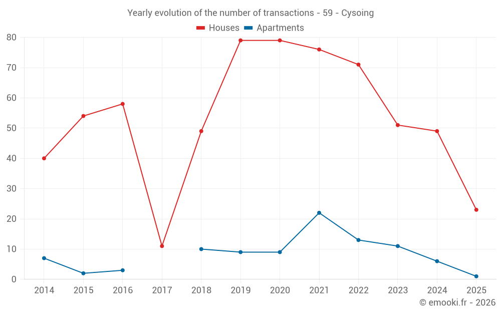 The median price on the 23 house transactions of the last 6 months in the municipality of Cysoing was 2 650 € per square meter for a median property value of 250 000 €. Over this period, 60% of transactions were between 1 638 and 3 375 € per square meter (from the 2nd to the 8th deciles).