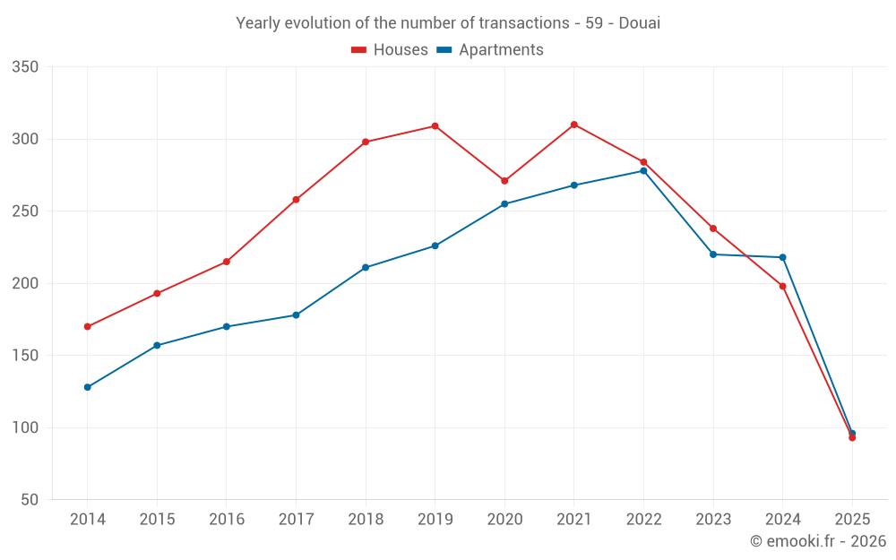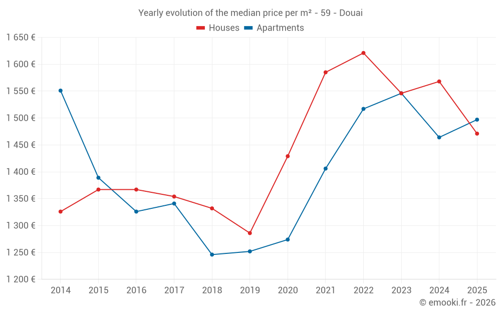 The median price on the 43 house transactions of the last 3 months in the municipality of Douai was 1 435 € per square meter for a median property value of 120 500 €. Over this period, 60% of transactions were between 947 and 2 115 € per square meter (from the 2nd to the 8th deciles).