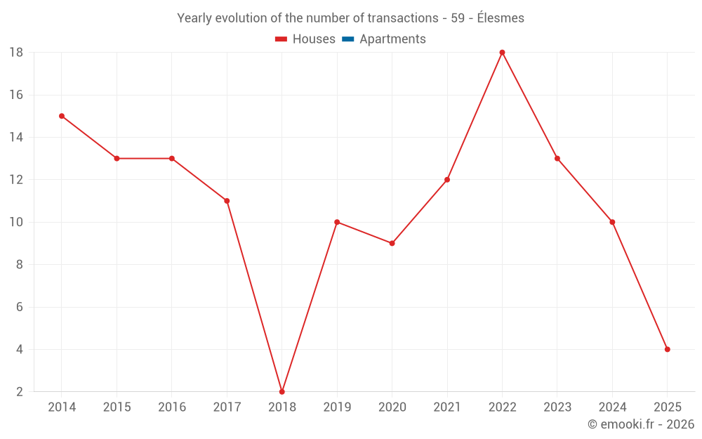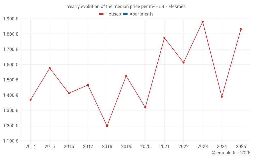 The median price on the 22 house transactions of the last 24 months in the municipality of Élesmes was 1 706 € per square meter for a median property value of 185 000 €. Over this period, 60% of transactions were between 1 281 and 2 269 € per square meter (from the 2nd to the 8th deciles).