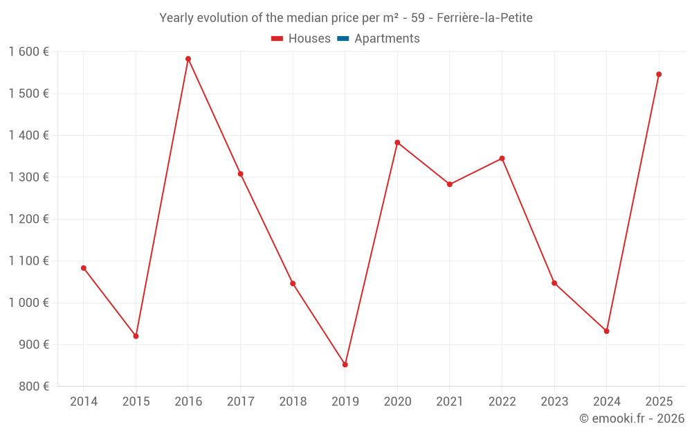 The median price on the 24 house transactions of the last 24 months in the municipality of Ferrière-la-Petite was 1 138 € per square meter for a median property value of 113 500 €. Over this period, 60% of transactions were between 786 and 1 672 € per square meter (from the 2nd to the 8th deciles).