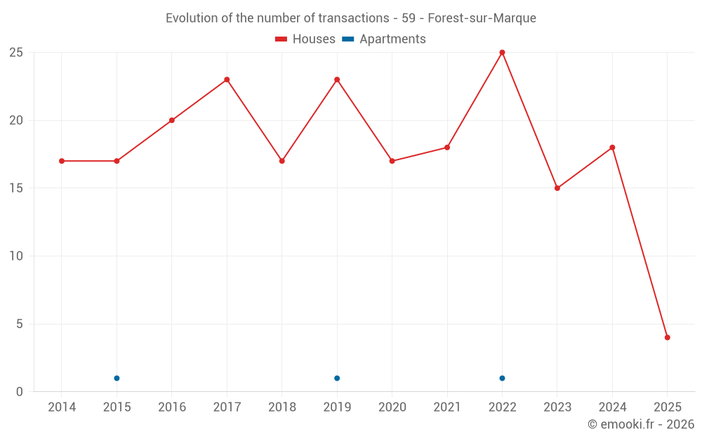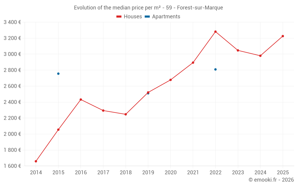 The median price on the 29 house transactions of the last 24 months in the municipality of Forest-sur-Marque was 3 142 € per square meter for a median property value of 299 500 €. Over this period, 60% of transactions were between 2 340 and 3 597 € per square meter (from the 2nd to the 8th deciles).