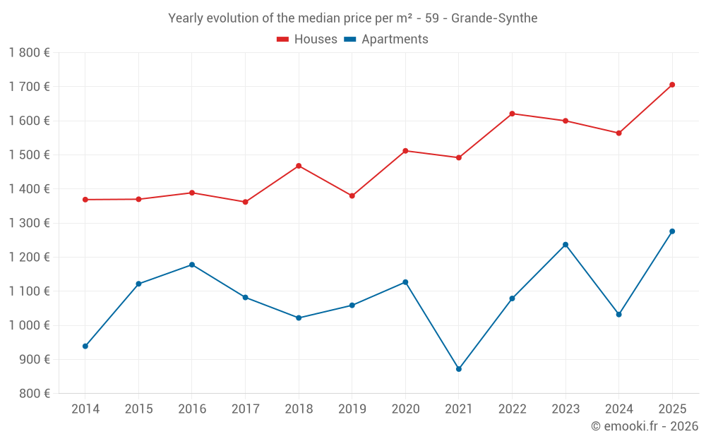 The median price on the 34 house transactions of the last 6 months in the municipality of Grande-Synthe was 1 706 € per square meter for a median property value of 147 175 €. Over this period, 60% of transactions were between 1 408 and 1 952 € per square meter (from the 2nd to the 8th deciles).
