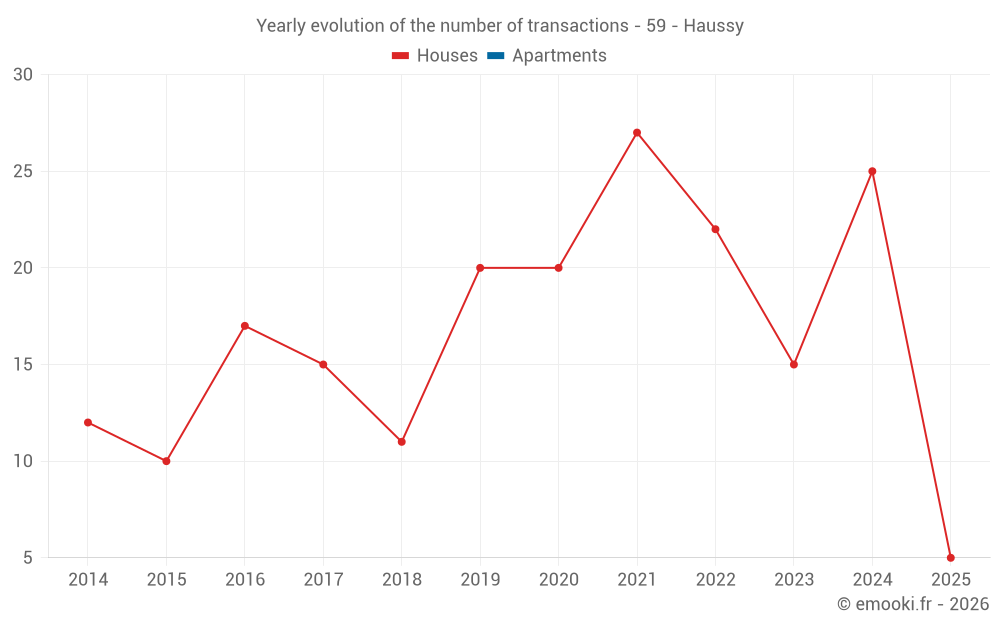 The median price on the 22 house transactions of the last 12 months in the municipality of Haussy was 1 116 € per square meter for a median property value of 94 500 €. Over this period, 60% of transactions were between 599 and 1 772 € per square meter (from the 2nd to the 8th deciles).