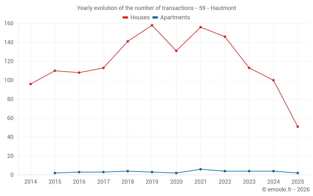 The median price on the 25 house transactions of the last 3 months in the municipality of Hautmont was 1 034 € per square meter for a median property value of 88 000 €. Over this period, 60% of transactions were between 553 and 1 707 € per square meter (from the 2nd to the 8th deciles).