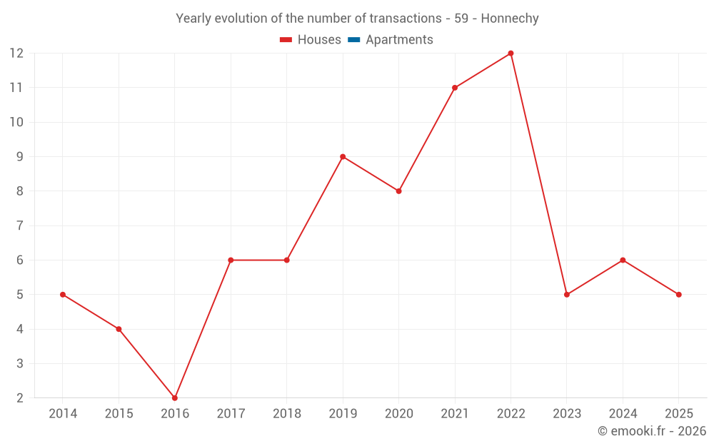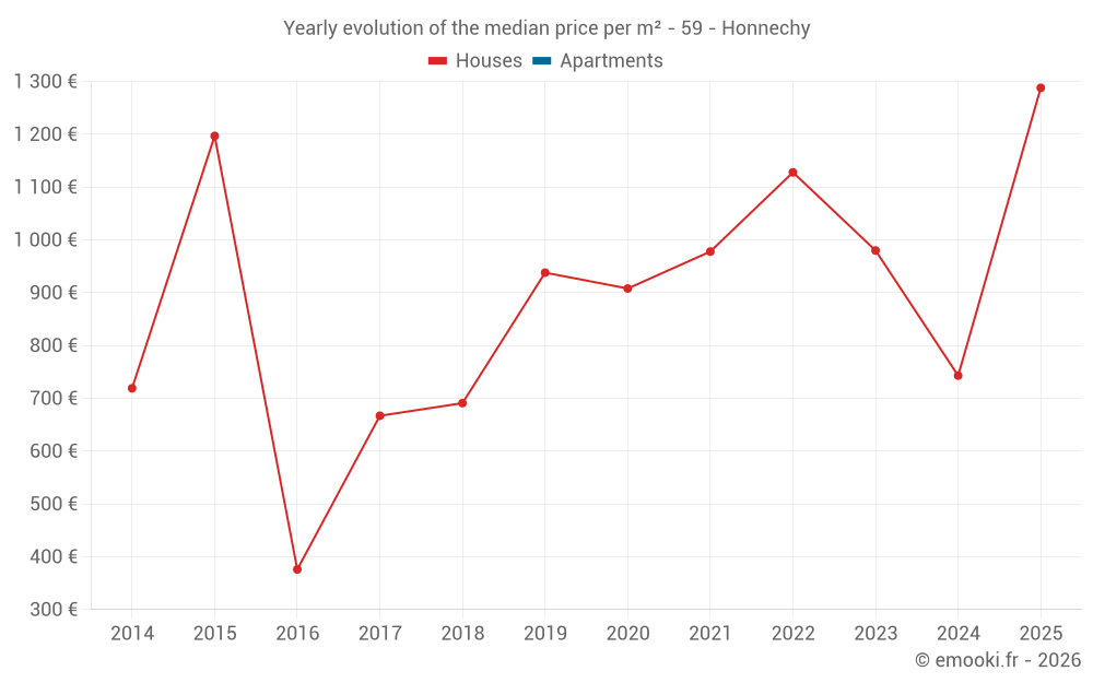 The median price on the 14 house transactions of the last 24 months in the municipality of Honnechy was 898 € per square meter for a median property value of 70 000 €. Over this period, 60% of transactions were between 571 and 1 259 € per square meter (from the 2nd to the 8th deciles).