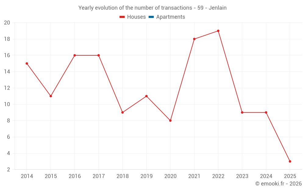 The median price on the 15 house transactions of the last 24 months in the municipality of Jenlain was 1 862 € per square meter for a median property value of 177 200 €. Over this period, 60% of transactions were between 1 158 and 2 248 € per square meter (from the 2nd to the 8th deciles).