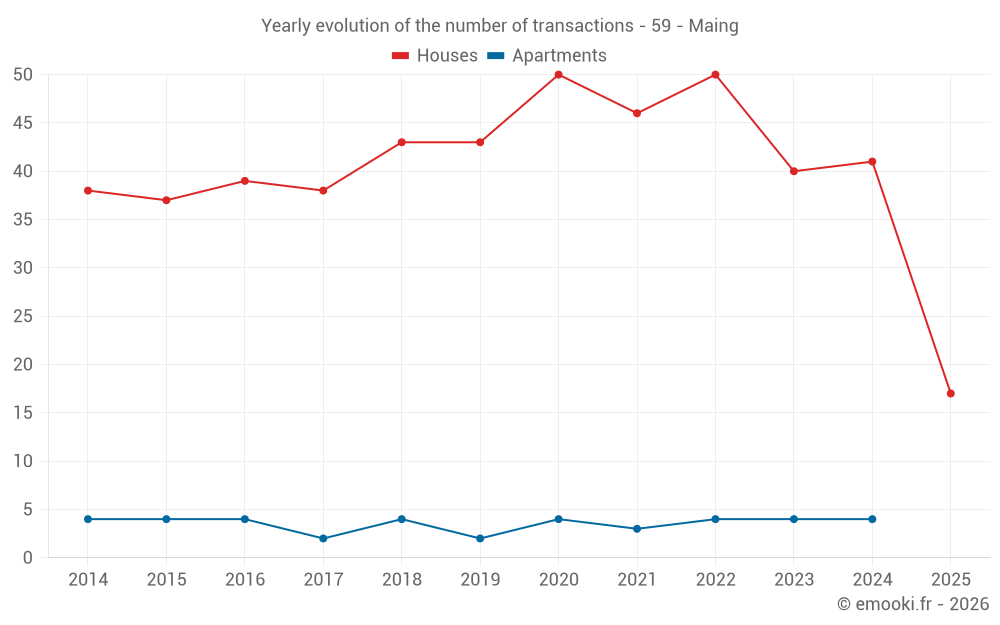 The median price on the 35 house transactions of the last 12 months in the municipality of Maing was 1 349 € per square meter for a median property value of 132 420 €. Over this period, 60% of transactions were between 725 and 1 778 € per square meter (from the 2nd to the 8th deciles).
