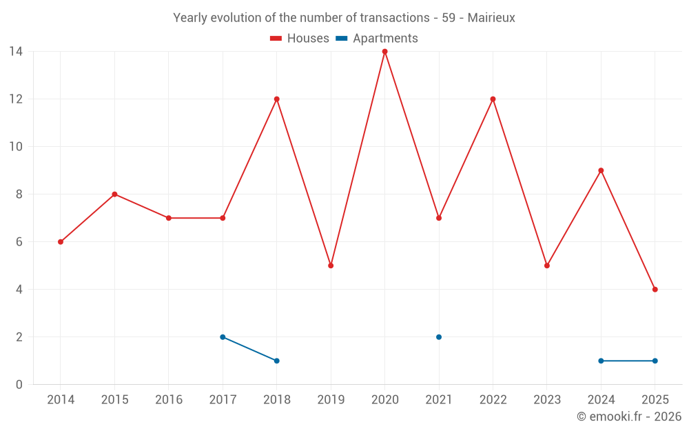 The median price on the 15 house transactions of the last 24 months in the municipality of Mairieux was 1 882 € per square meter for a median property value of 206 000 €. Over this period, 60% of transactions were between 1 610 and 2 330 € per square meter (from the 2nd to the 8th deciles).