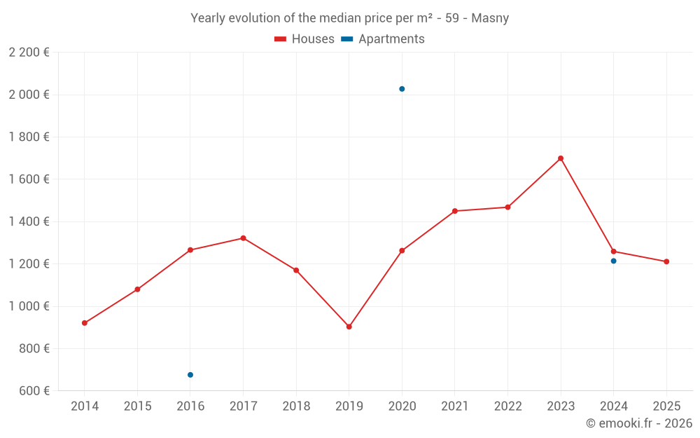 The median price on the 25 house transactions of the last 12 months in the municipality of Masny was 1 270 € per square meter for a median property value of 124 000 €. Over this period, 60% of transactions were between 944 and 1 674 € per square meter (from the 2nd to the 8th deciles).