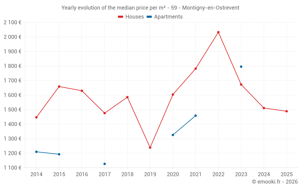 The median price on the 25 house transactions of the last 12 months in the municipality of Montigny-en-Ostrevent was 1 519 € per square meter for a median property value of 161 050 €. Over this period, 60% of transactions were between 1 088 and 2 062 € per square meter (from the 2nd to the 8th deciles).