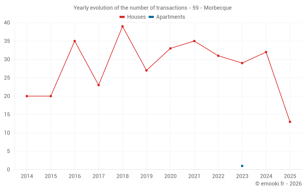The median price on the 35 house transactions of the last 12 months in the municipality of Morbecque was 1 717 € per square meter for a median property value of 198 500 €. Over this period, 60% of transactions were between 1 238 and 2 770 € per square meter (from the 2nd to the 8th deciles).