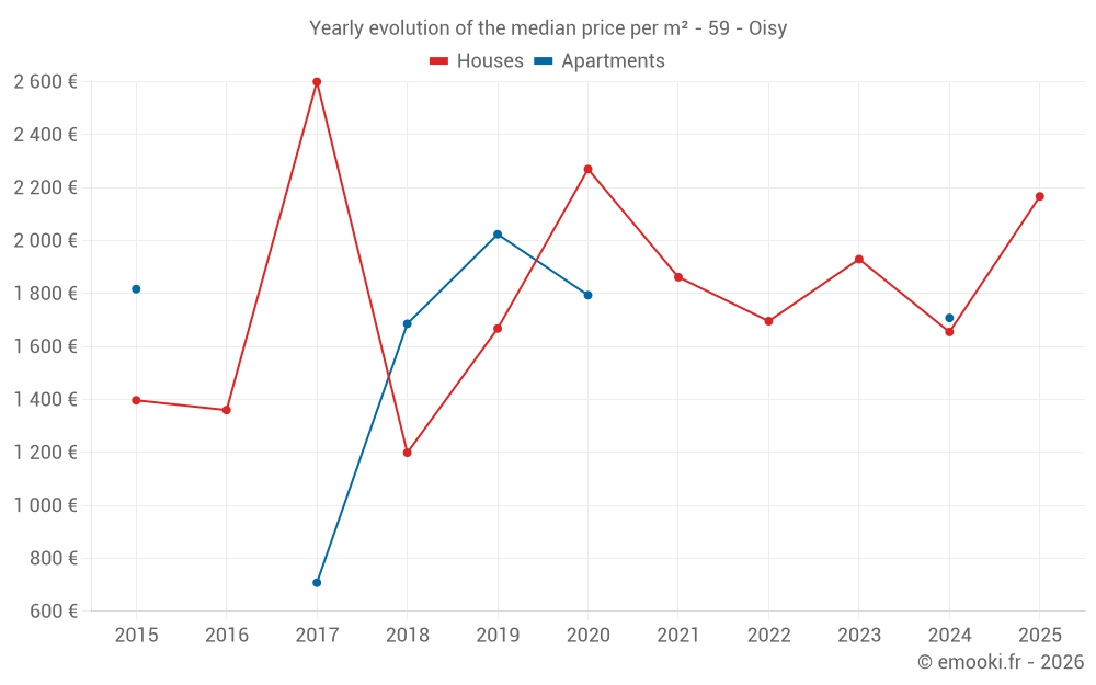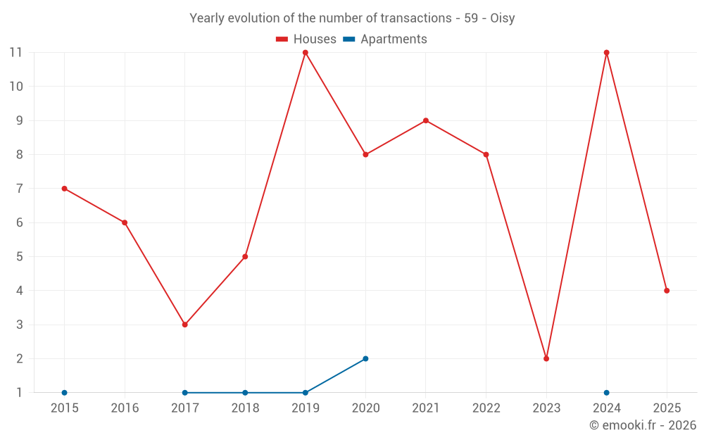 The median price on the 16 house transactions of the last 24 months in the municipality of Oisy was 1 967 € per square meter for a median property value of 262 750 €. Over this period, 60% of transactions were between 1 558 and 2 664 € per square meter (from the 2nd to the 8th deciles).