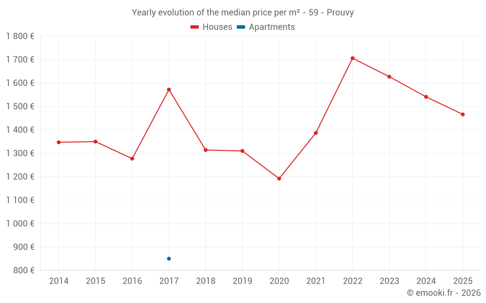 The median price on the 16 house transactions of the last 12 months in the municipality of Prouvy was 1 524 € per square meter for a median property value of 175 000 €. Over this period, 60% of transactions were between 787 and 1 923 € per square meter (from the 2nd to the 8th deciles).
