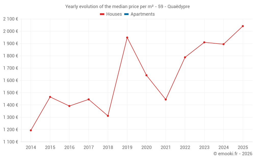 The median price on the 29 house transactions of the last 24 months in the municipality of Quaëdypre was 1 959 € per square meter for a median property value of 200 000 €. Over this period, 60% of transactions were between 1 538 and 2 443 € per square meter (from the 2nd to the 8th deciles).