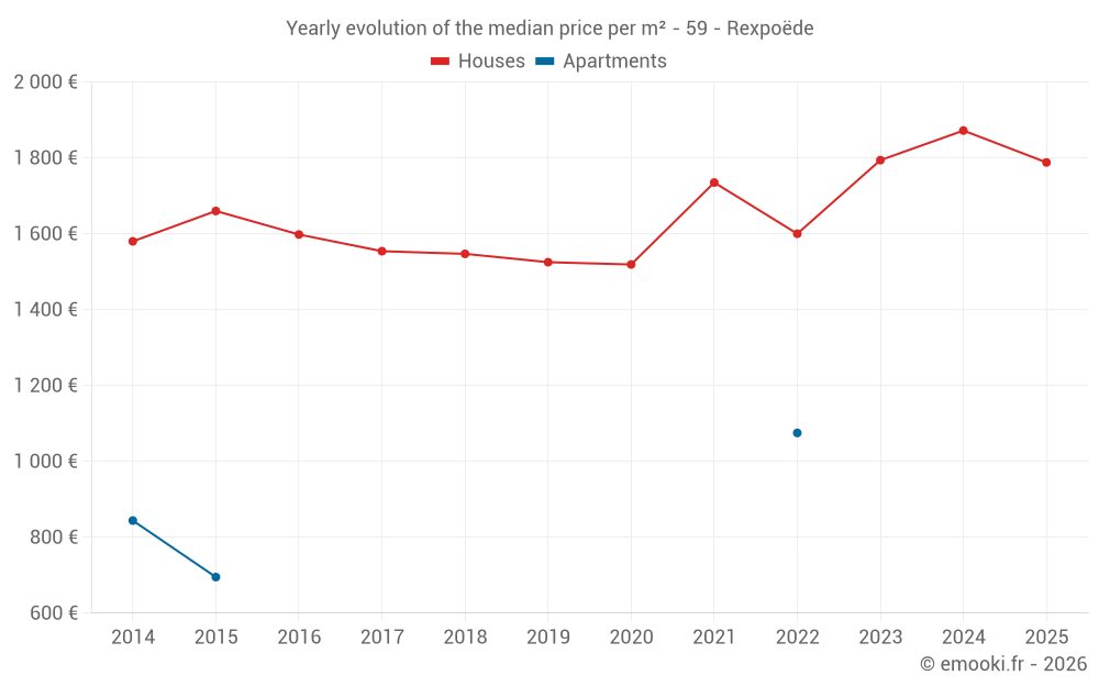 The median price on the 22 house transactions of the last 12 months in the municipality of Rexpoëde was 1 788 € per square meter for a median property value of 197 500 €. Over this period, 60% of transactions were between 1 151 and 2 190 € per square meter (from the 2nd to the 8th deciles).
