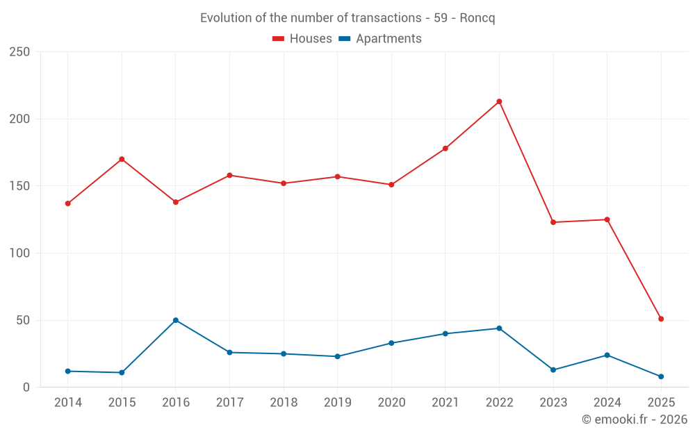 The median price on the 51 house transactions of the last 6 months in the municipality of Roncq was 2 814 € per square meter for a median property value of 258 900 €. Over this period, 60% of transactions were between 1 988 and 3 434 € per square meter (from the 2nd to the 8th deciles).