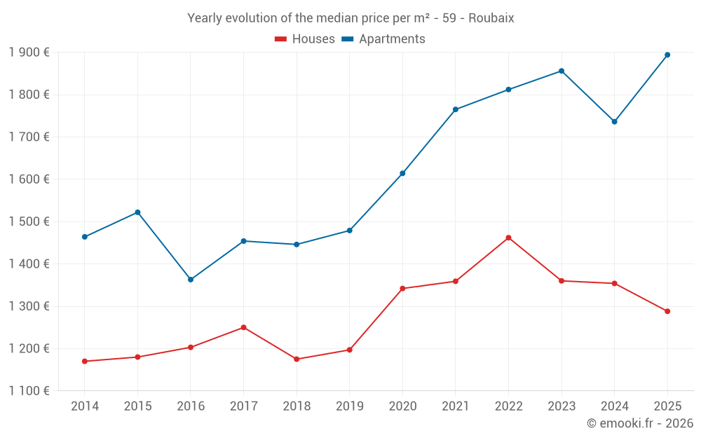 The median price on the 42 apartment transactions of the last 3 months in the municipality of Roubaix was 1 884 € per square meter for a median property value of 126 300 €. Over this period, 60% of transactions were between 1 365 and 2 408 € per square meter (from the 2nd to the 8th deciles).