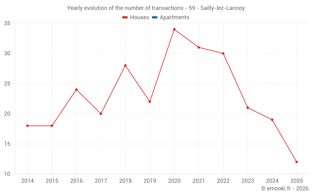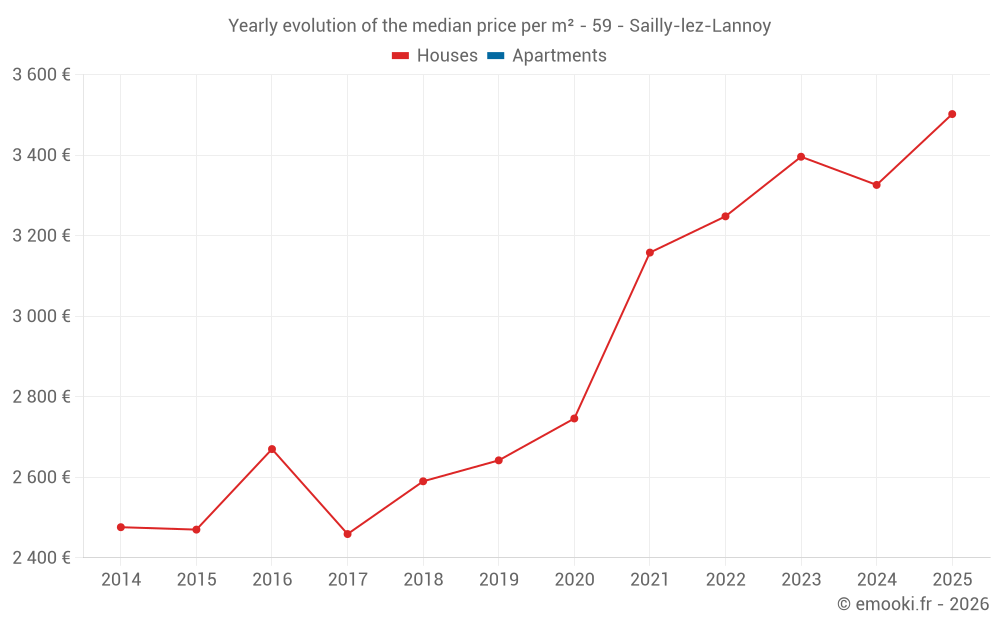 The median price on the 26 house transactions of the last 12 months in the municipality of Sailly-lez-Lannoy was 3 373 € per square meter for a median property value of 431 500 €. Over this period, 60% of transactions were between 2 748 and 4 085 € per square meter (from the 2nd to the 8th deciles).