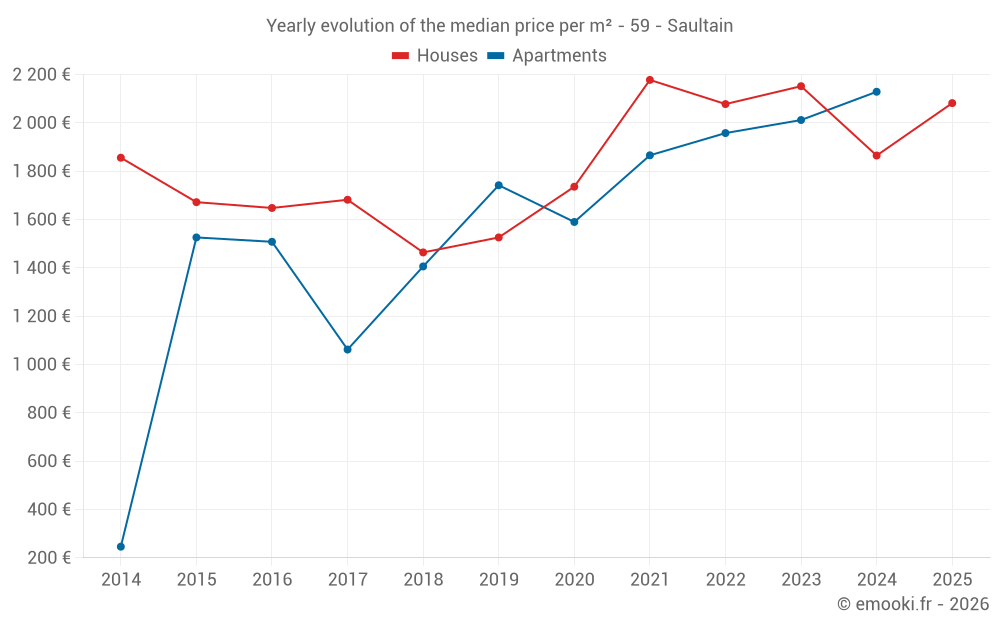 The median price on the 21 house transactions of the last 12 months in the municipality of Saultain was 2 067 € per square meter for a median property value of 175 000 €. Over this period, 60% of transactions were between 1 521 and 2 492 € per square meter (from the 2nd to the 8th deciles).