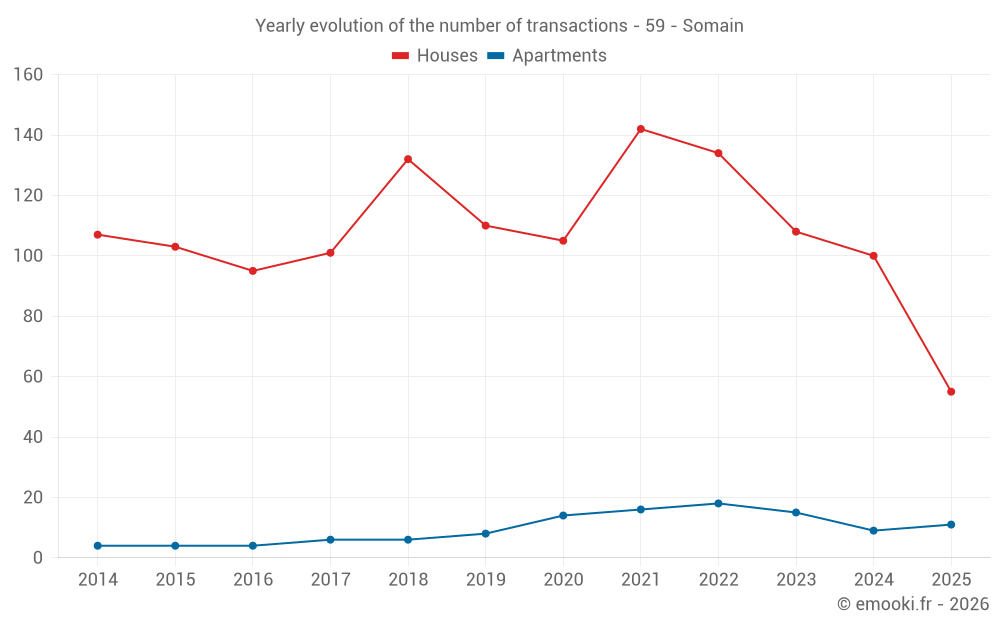 The median price on the 28 house transactions of the last 3 months in the municipality of Somain was 1 260 € per square meter for a median property value of 107 850 €. Over this period, 60% of transactions were between 766 and 1 858 € per square meter (from the 2nd to the 8th deciles).
