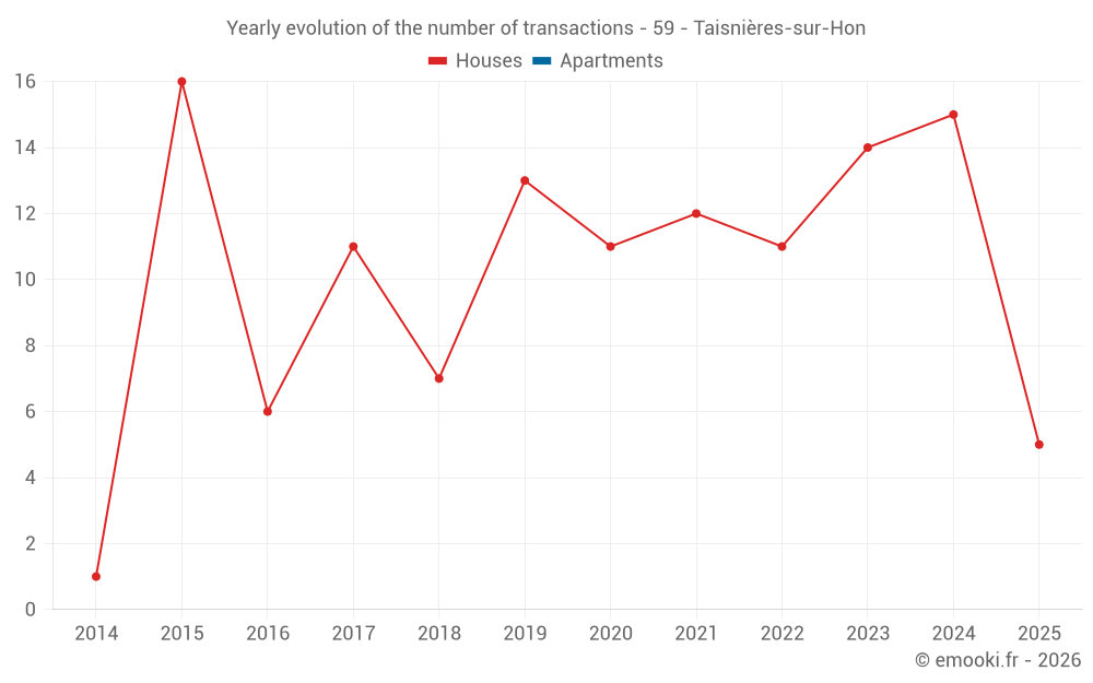 The median price on the 26 house transactions of the last 24 months in the municipality of Taisnières-sur-Hon was 1 402 € per square meter for a median property value of 195 000 €. Over this period, 60% of transactions were between 1 058 and 2 284 € per square meter (from the 2nd to the 8th deciles).