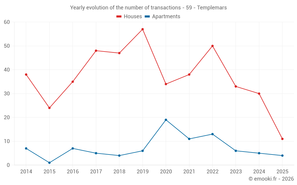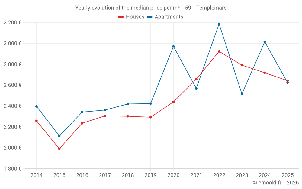 The median price on the 33 house transactions of the last 12 months in the municipality of Templemars was 2 669 € per square meter for a median property value of 253 760 €. Over this period, 60% of transactions were between 1 921 and 3 289 € per square meter (from the 2nd to the 8th deciles).