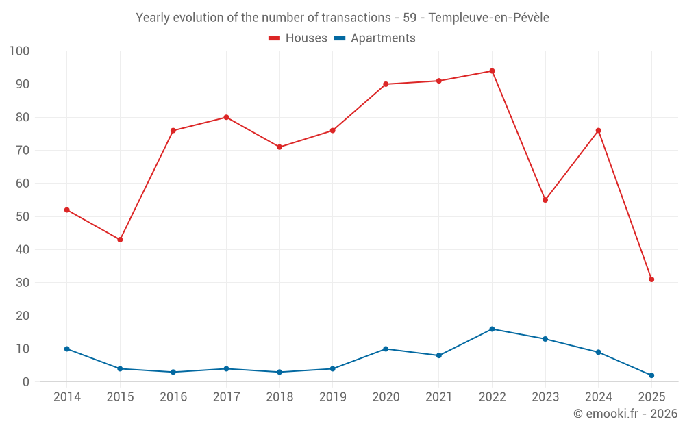 The median price on the 31 house transactions of the last 6 months in the municipality of Templeuve-en-Pévèle was 2 702 € per square meter for a median property value of 250 000 €. Over this period, 60% of transactions were between 2 293 and 3 238 € per square meter (from the 2nd to the 8th deciles).