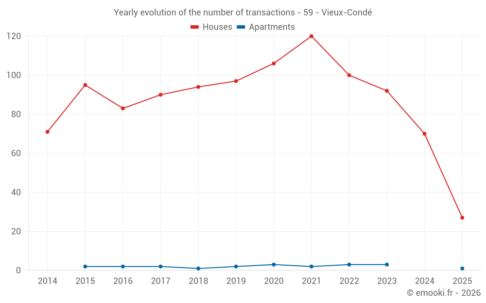 The median price on the 27 house transactions of the last 6 months in the municipality of Vieux-Condé was 1 188 € per square meter for a median property value of 124 000 €. Over this period, 60% of transactions were between 678 and 1 825 € per square meter (from the 2nd to the 8th deciles).