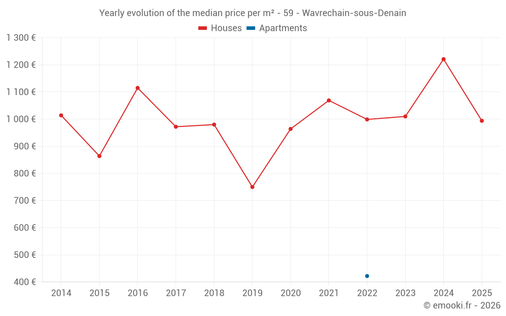 The median price on the 24 house transactions of the last 24 months in the municipality of Wavrechain-sous-Denain was 1 005 € per square meter for a median property value of 78 750 €. Over this period, 60% of transactions were between 637 and 1 433 € per square meter (from the 2nd to the 8th deciles).