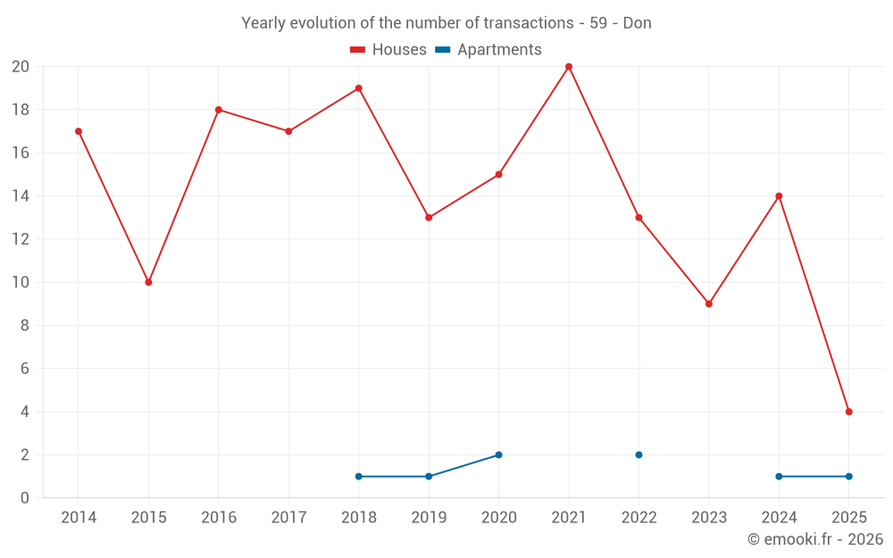 The median price on the 18 house transactions of the last 24 months in the municipality of Don was 2 054 € per square meter for a median property value of 199 000 €. Over this period, 60% of transactions were between 1 724 and 2 645 € per square meter (from the 2nd to the 8th deciles).