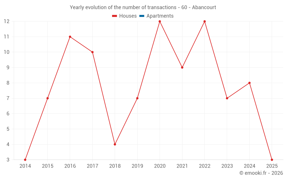 The median price on the 14 house transactions of the last 24 months in the municipality of Abancourt was 1 608 € per square meter for a median property value of 126 000 €. Over this period, 60% of transactions were between 943 and 1 806 € per square meter (from the 2nd to the 8th deciles).