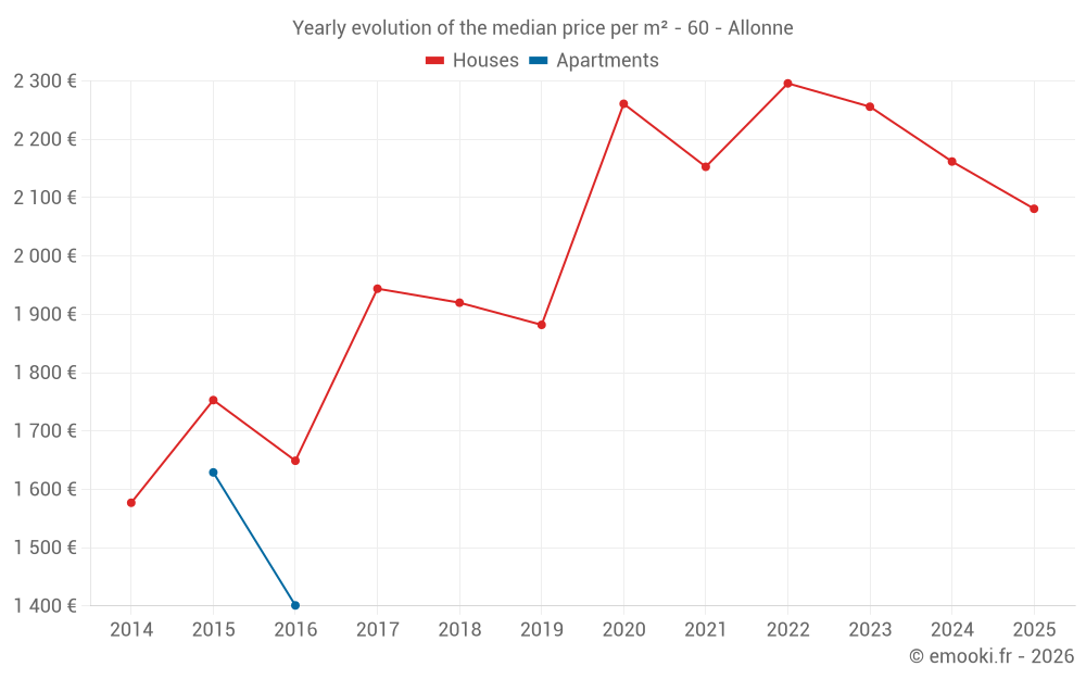 The median price on the 28 house transactions of the last 24 months in the municipality of Allonne was 2 191 € per square meter for a median property value of 246 794 €. Over this period, 60% of transactions were between 1 784 and 2 530 € per square meter (from the 2nd to the 8th deciles).
