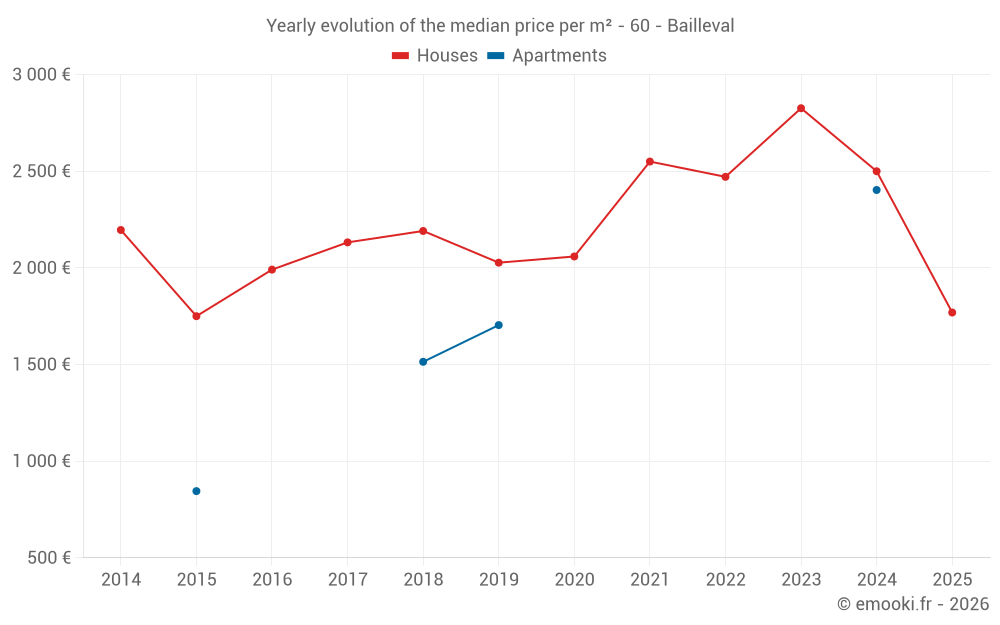 The median price on the 24 house transactions of the last 24 months in the municipality of Bailleval was 2 480 € per square meter for a median property value of 193 000 €. Over this period, 60% of transactions were between 1 526 and 2 950 € per square meter (from the 2nd to the 8th deciles).