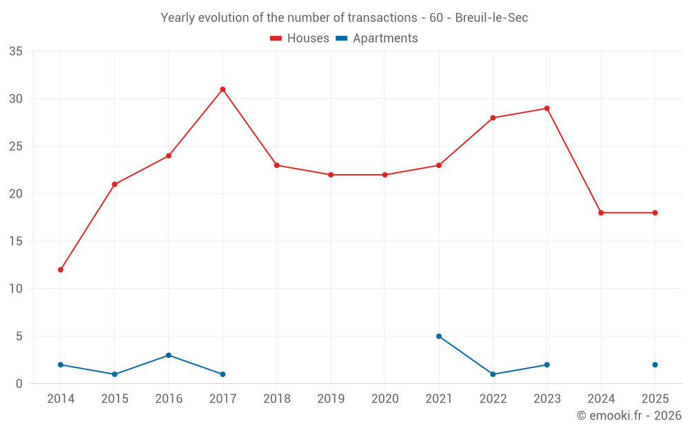 The median price on the 18 house transactions of the last 6 months in the municipality of Breuil-le-Sec was 2 198 € per square meter for a median property value of 187 500 €. Over this period, 60% of transactions were between 1 536 and 2 671 € per square meter (from the 2nd to the 8th deciles).