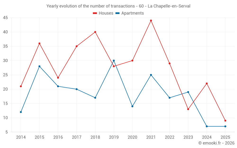 The median price on the 24 house transactions of the last 12 months in the municipality of La Chapelle-en-Serval was 3 026 € per square meter for a median property value of 353 750 €. Over this period, 60% of transactions were between 2 496 and 4 034 € per square meter (from the 2nd to the 8th deciles).