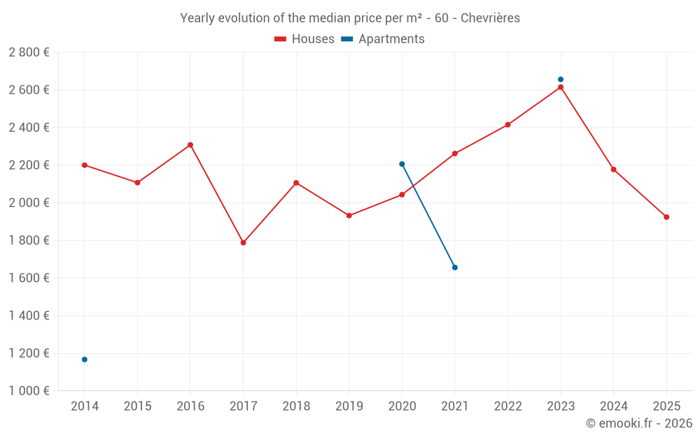 The median price on the 21 house transactions of the last 12 months in the municipality of Chevrières was 2 186 € per square meter for a median property value of 180 000 €. Over this period, 60% of transactions were between 1 697 and 2 683 € per square meter (from the 2nd to the 8th deciles).