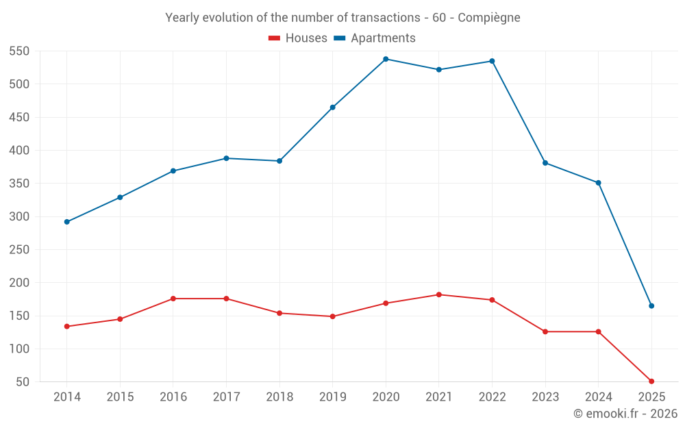 The median price on the 83 apartment transactions of the last 3 months in the municipality of Compiègne was 2 217 € per square meter for a median property value of 117 000 €. Over this period, 60% of transactions were between 1 671 and 2 859 € per square meter (from the 2nd to the 8th deciles).