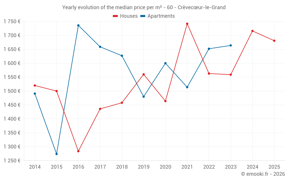The median price on the 27 house transactions of the last 12 months in the municipality of Crèvecœur-le-Grand was 1 747 € per square meter for a median property value of 145 000 €. Over this period, 60% of transactions were between 1 124 and 2 187 € per square meter (from the 2nd to the 8th deciles).