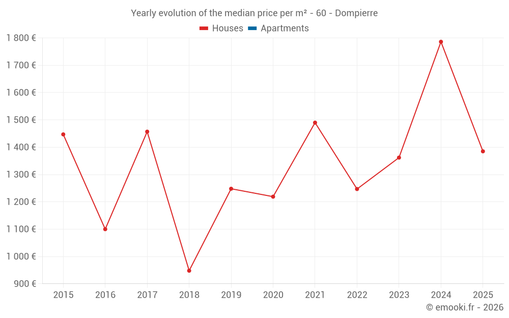 The median price on the 14 house transactions of the last 24 months in the municipality of Dompierre was 1 442 € per square meter for a median property value of 134 500 €. Over this period, 60% of transactions were between 1 252 and 1 836 € per square meter (from the 2nd to the 8th deciles).