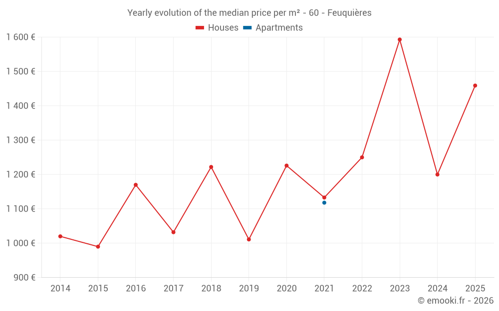 The median price on the 21 house transactions of the last 24 months in the municipality of Feuquières was 1 212 € per square meter for a median property value of 110 000 €. Over this period, 60% of transactions were between 933 and 1 833 € per square meter (from the 2nd to the 8th deciles).