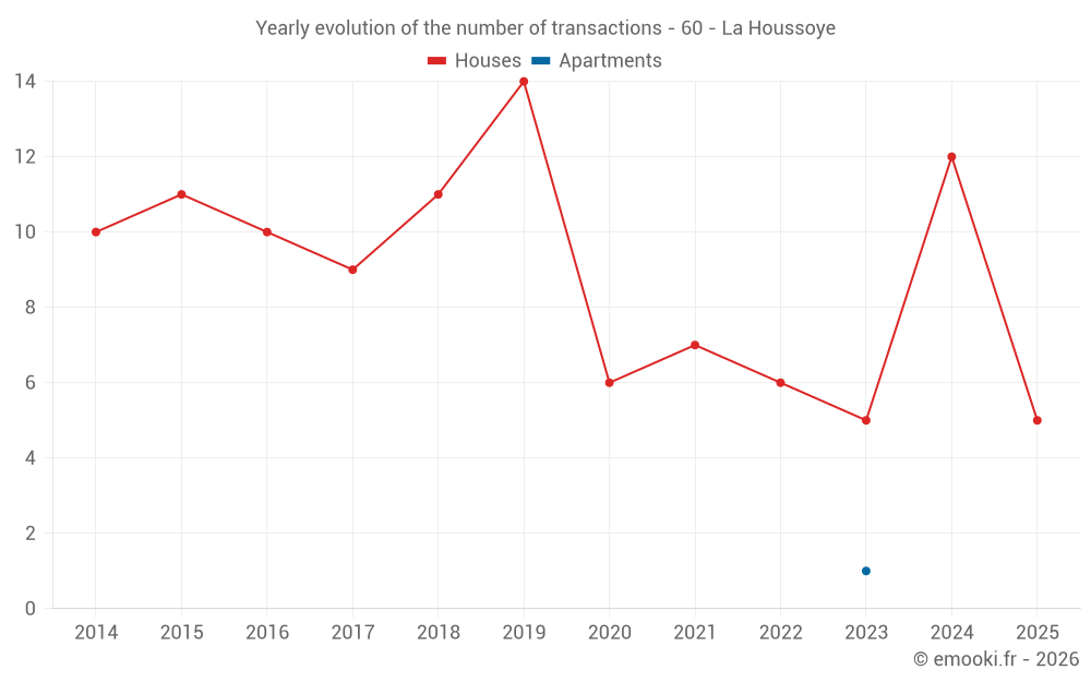 The median price on the 19 house transactions of the last 24 months in the municipality of La Houssoye was 2 155 € per square meter for a median property value of 167 000 €. Over this period, 60% of transactions were between 1 600 and 2 578 € per square meter (from the 2nd to the 8th deciles).