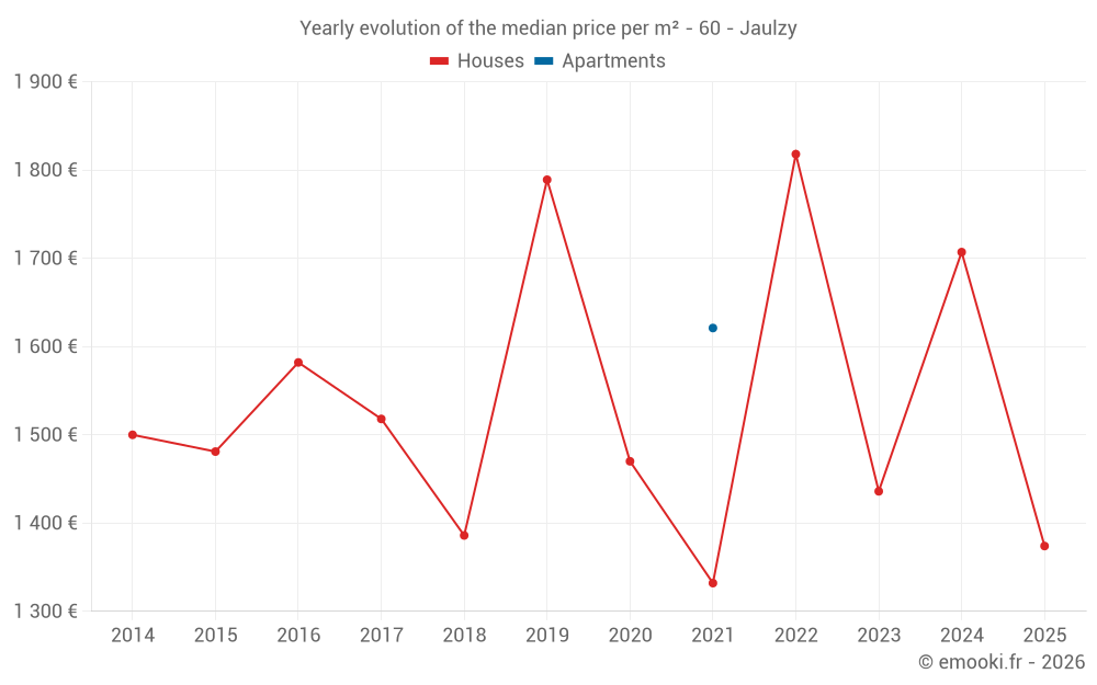 The median price on the 17 house transactions of the last 24 months in the municipality of Jaulzy was 1 690 € per square meter for a median property value of 128 000 €. Over this period, 60% of transactions were between 1 085 and 1 991 € per square meter (from the 2nd to the 8th deciles).