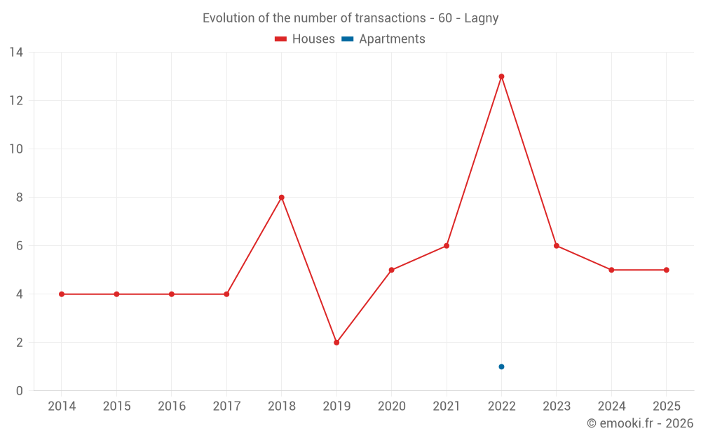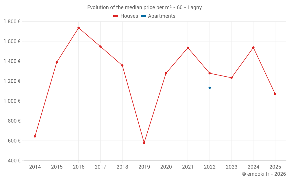The median price on the 14 house transactions of the last 24 months in the municipality of Lagny was 1 396 € per square meter for a median property value of 137 250 €. Over this period, 60% of transactions were between 963 and 1 851 € per square meter (from the 2nd to the 8th deciles).