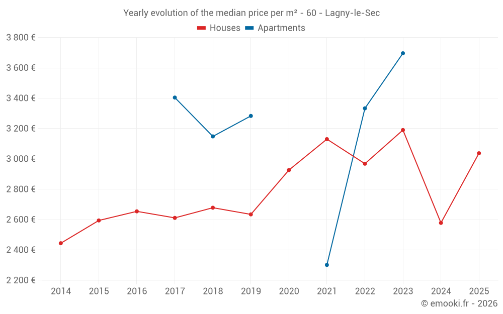 The median price on the 19 house transactions of the last 12 months in the municipality of Lagny-le-Sec was 2 864 € per square meter for a median property value of 280 600 €. Over this period, 60% of transactions were between 2 276 and 3 312 € per square meter (from the 2nd to the 8th deciles).
