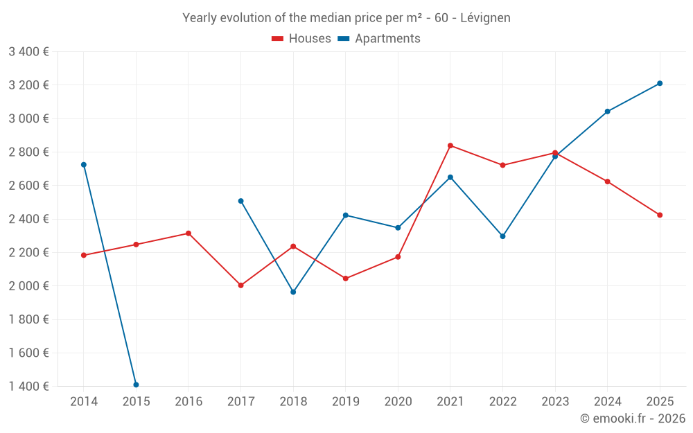 The median price on the 22 house transactions of the last 24 months in the municipality of Lévignen was 2 726 € per square meter for a median property value of 237 450 €. Over this period, 60% of transactions were between 1 831 and 2 931 € per square meter (from the 2nd to the 8th deciles).