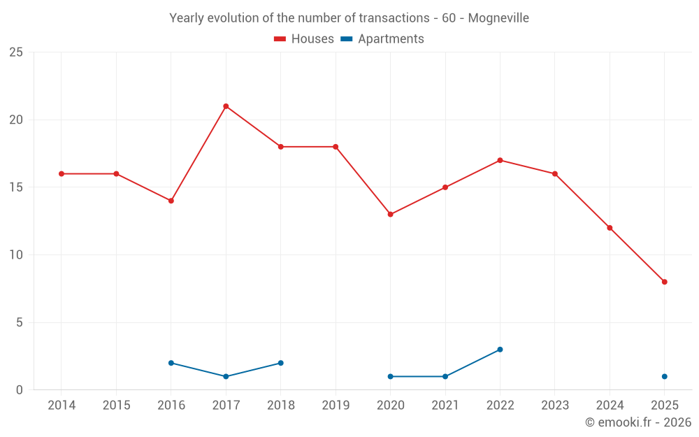 The median price on the 17 house transactions of the last 12 months in the municipality of Mogneville was 2 343 € per square meter for a median property value of 220 000 €. Over this period, 60% of transactions were between 2 007 and 2 641 € per square meter (from the 2nd to the 8th deciles).