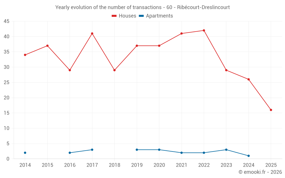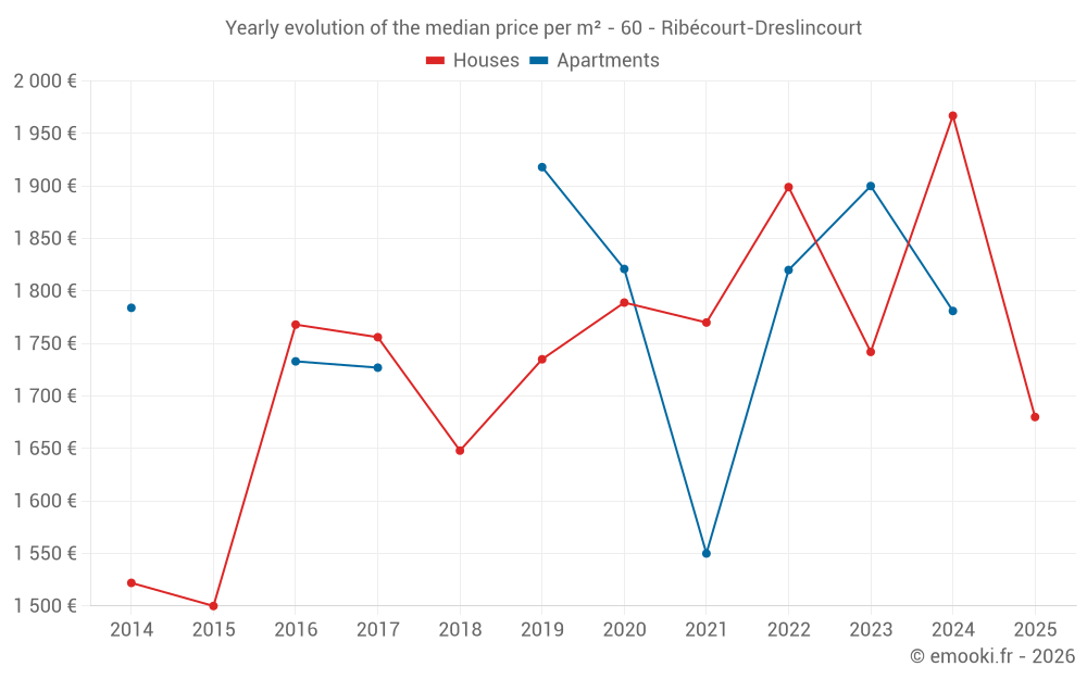 The median price on the 29 house transactions of the last 12 months in the municipality of Ribécourt-Dreslincourt was 1 875 € per square meter for a median property value of 160 000 €. Over this period, 60% of transactions were between 1 438 and 2 146 € per square meter (from the 2nd to the 8th deciles).